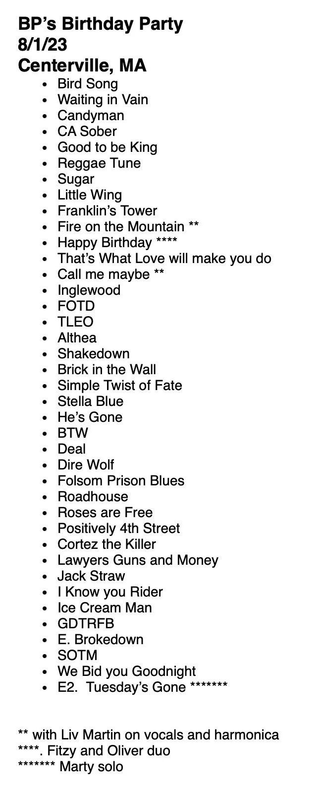 August 1 Aug 11 Written By Fitzy *inglewood = New Minglewood BluesFOTD=Friend of the DevilTLEO= They Love Each OtherBTW=Black Throated WindGDTRFB= Goin Down the Road Feelin BadSOTM=Standing on the Moon Fitzy