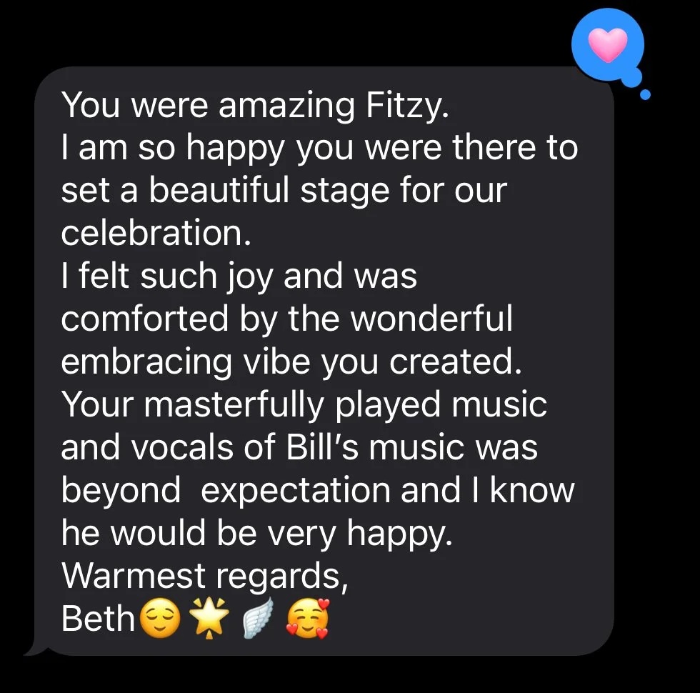 Bill had great taste in music. Honored to play in his memory. Thank you Beth, Jordan, and Greer.